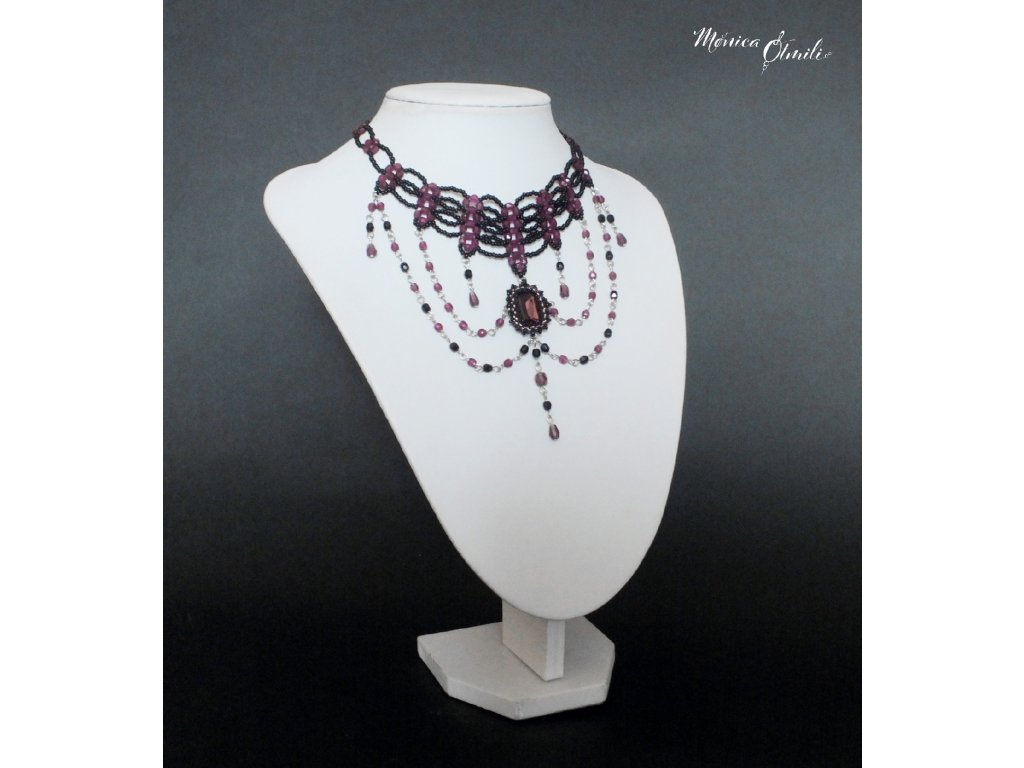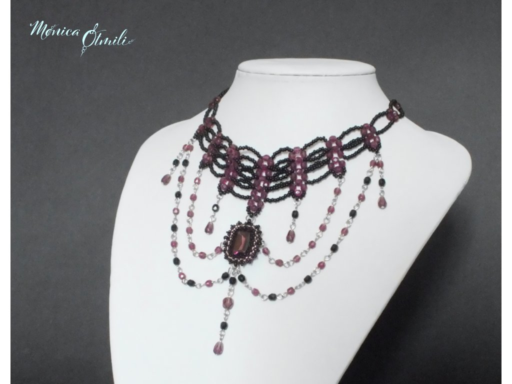 Elegantní šitý náhrdelník s nádechem starobylosti a tajemné gothic atmosféry. V náhrdelníku Isolde se mísí černá klasika s mystickou fialovou. Pozvedněte svůj společenský či „goth outfit“ jedinečným šperkem s precizním zpracováním.