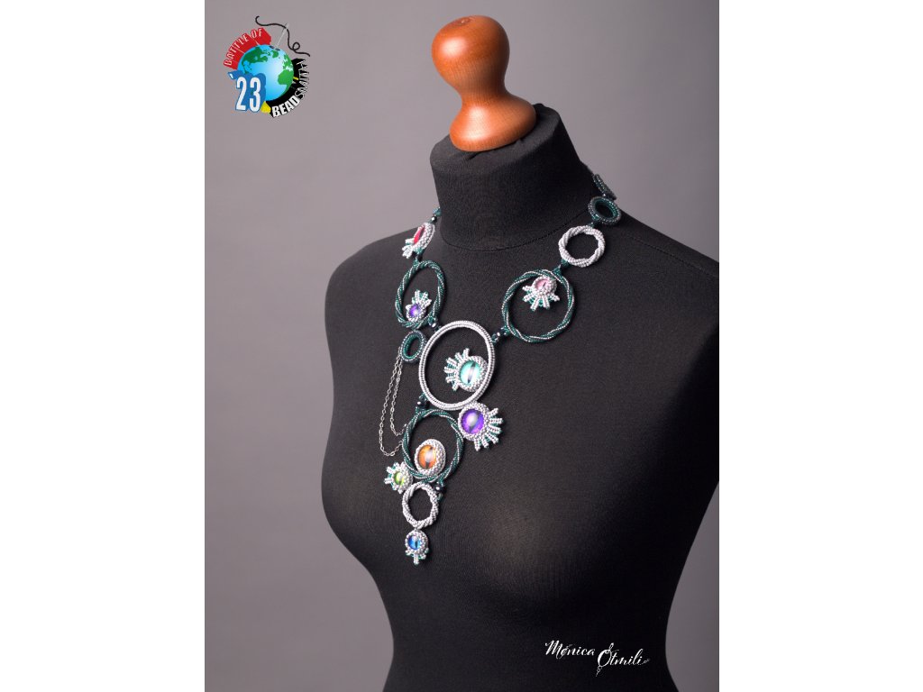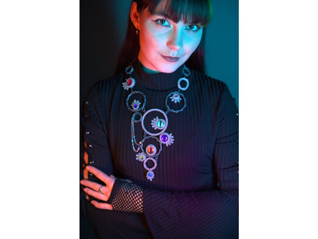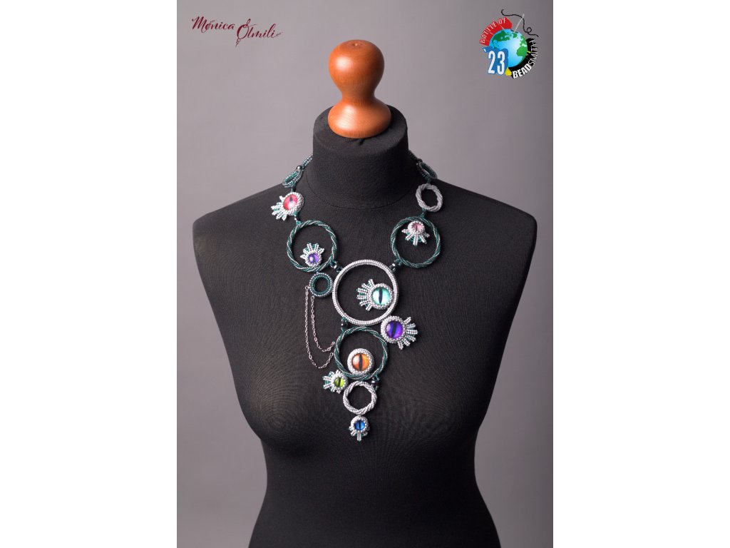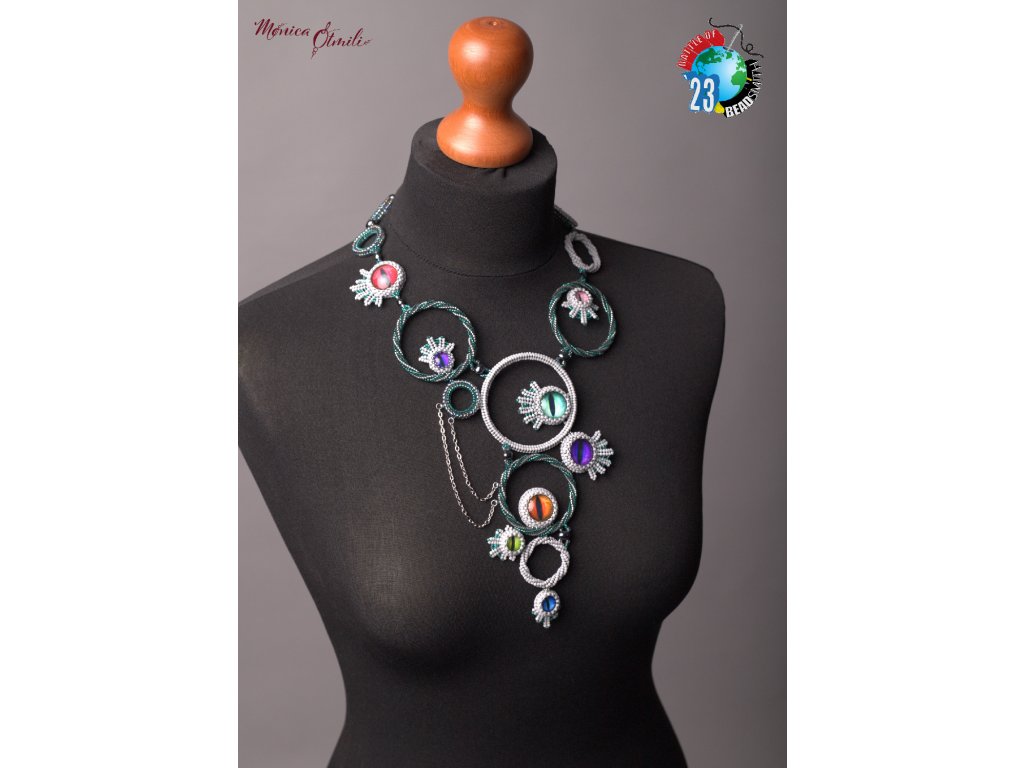 Na výrobu šperku byl použit kvalitní japonský skleněný rokajl, kovové komponenty z nerezové oceli (vhodné i pro alergiky), paměťový drát (uvnitř kruhů, nedochází ke kontaktu s pokožkou), Alcantara (začištění zadní strany oček), české broušené a mačkané perle, skleněné kabošony s grafickým motivem. Veškeré použité perle a perličky (= korálky) jsou skleněné. Zapínání na karabinku a nastavitelný řetízek. Náhrdelník je navzdory své velikosti velmi lehký.