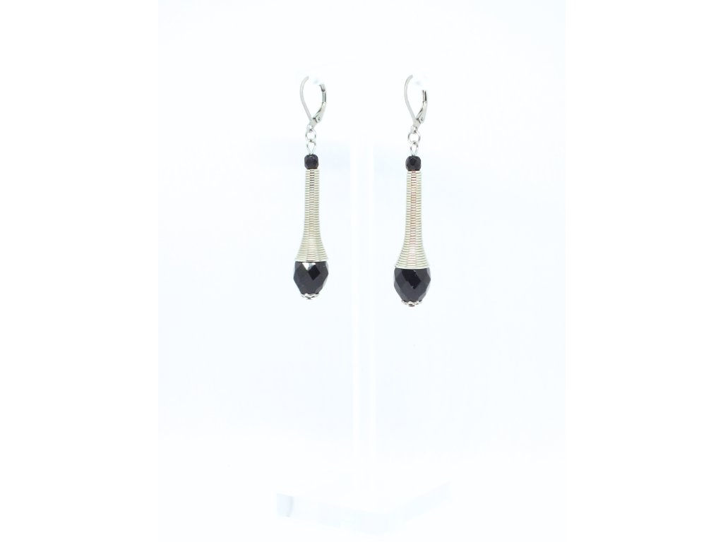 Zhotoveno ručně ze skleněných perlí a nerezové oceli. barevnost černá - stříbrná je činí univerzálním doplňkem, snadno kombinovatelným s oblečením. Mechanické zapínání náušnic je z chirurgické oceli, náušnice jsou tedy vhodné i pro alergiky.