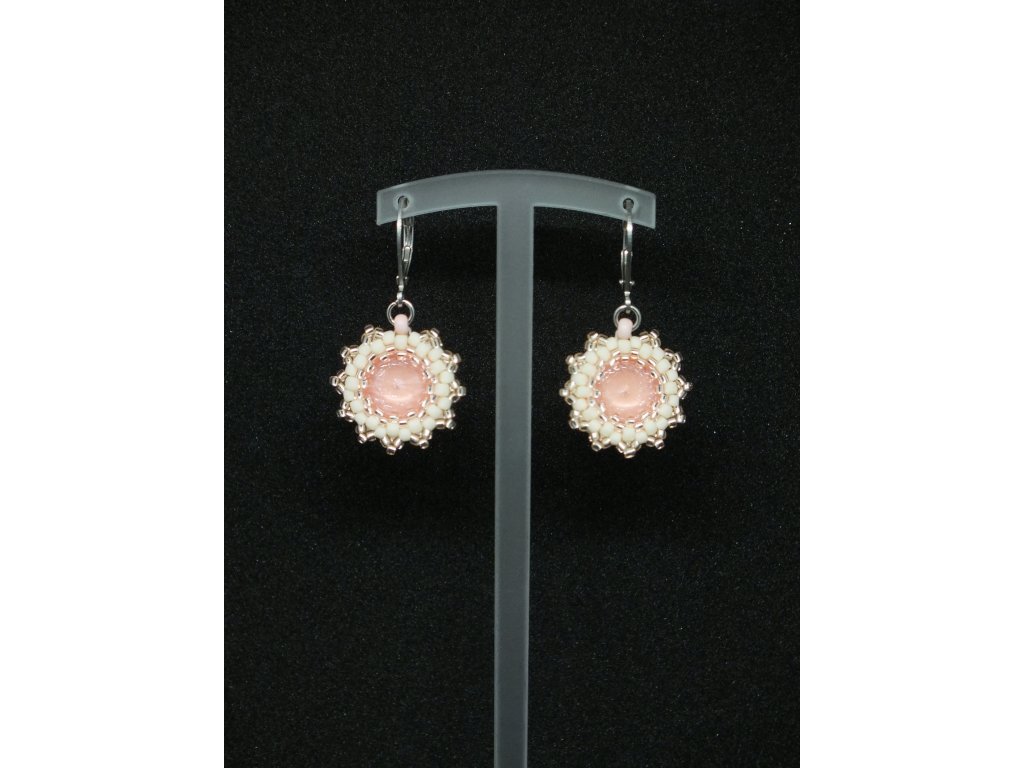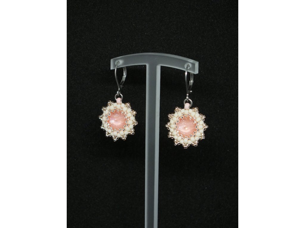 Decentní náušnice s broušenými krystaly vhodné pro denní nošení. Barevnost lososových broušených krystalů vytváří z těchto náušnic něžný a romantický šperk. Krystaly jsou obšity béžovým skleněným rokajlem a dozdobeny růžovými perličkami se stříbrným odleskem. Jemný třpyt těchto náušnic dodá šmrncovní tečku vašemu outfitu.