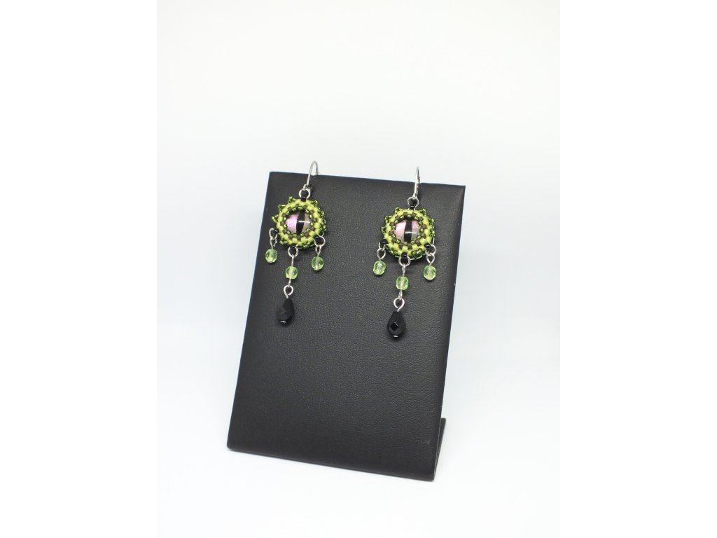 Visací náušnice inspirované fantastickými bytostmi. Probuďte v sobě krotitelku draků. Tyto náušnice tvoří skleněné kabošony, které jsou ručně podmalovány motivem dračích očí a následně dozdobeny skleněnými perlemi. Metalická podmalba září zelenými a růžovými odlesky. Zadní strana výšivky s okem je začištěna umělou semiší. Uhrančivý fantasy šperk, který nezůstane bez povšimnutí.
