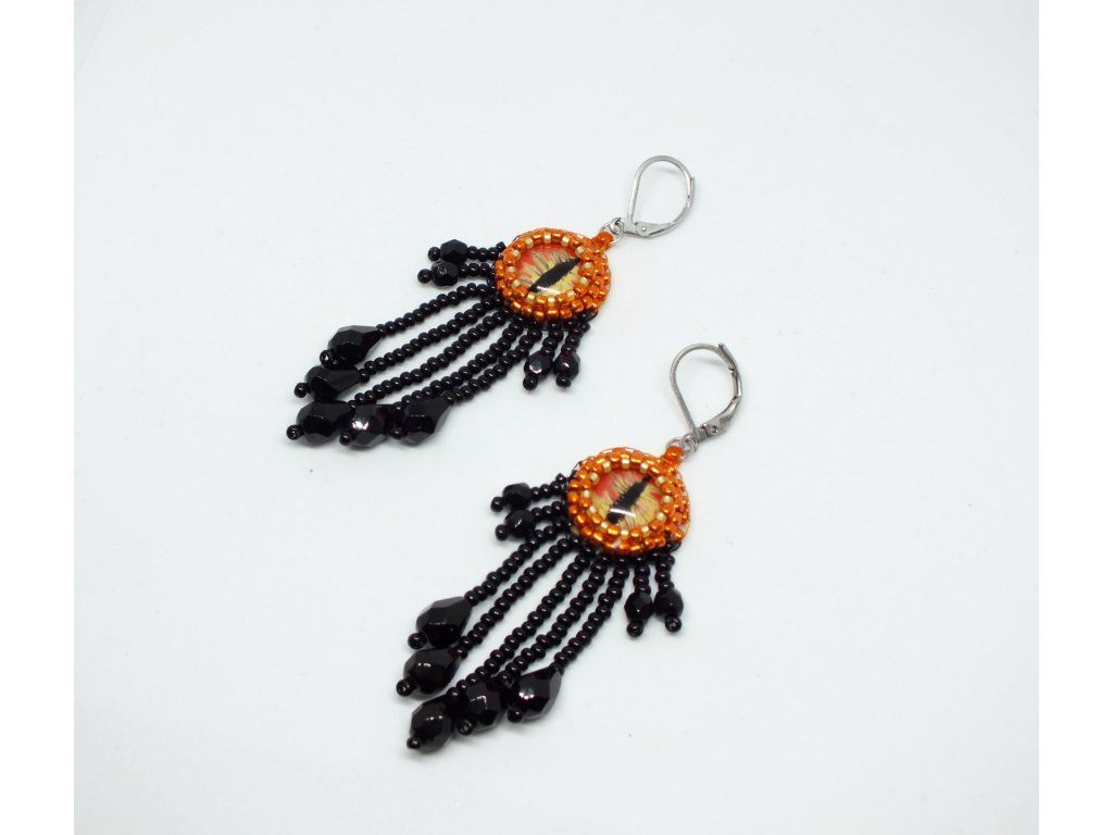 Tyto náušnice tvoří skleněné kabošony, které jsou ručně podmalovány motivem dračích očí a následně dozdobeny skleněným rokajlem a mačkanými antracitovými perlemi. Zadní strana výšivky s okem je začištěna umělou semiší.