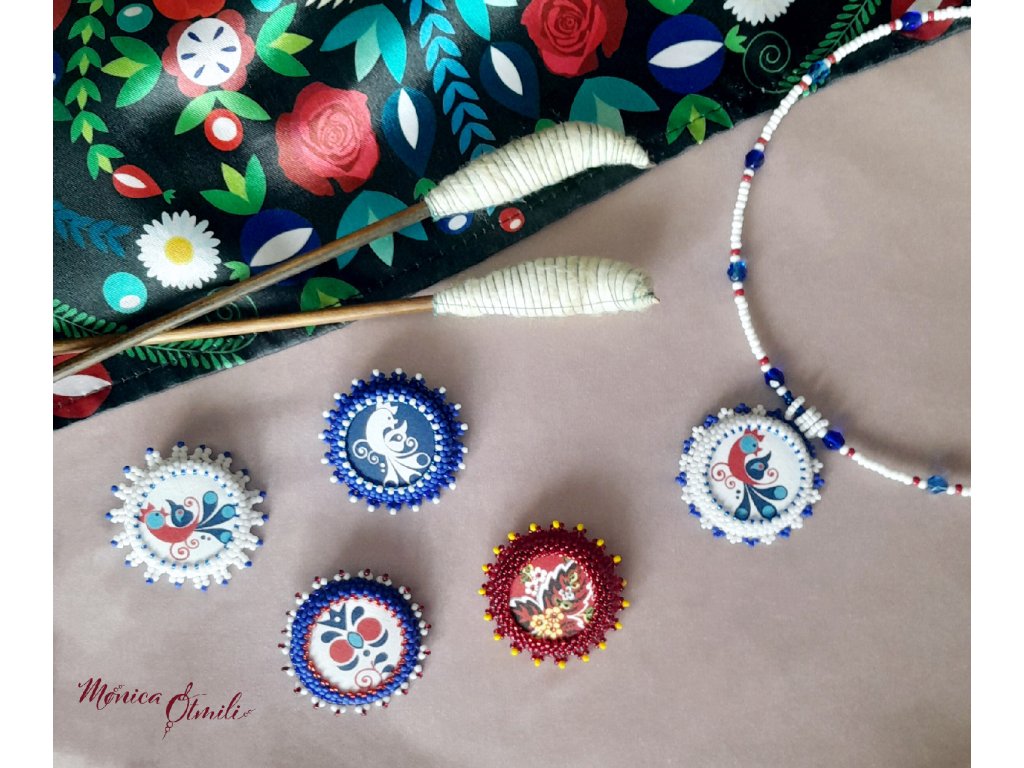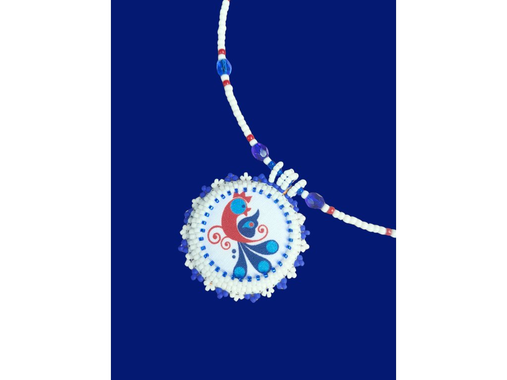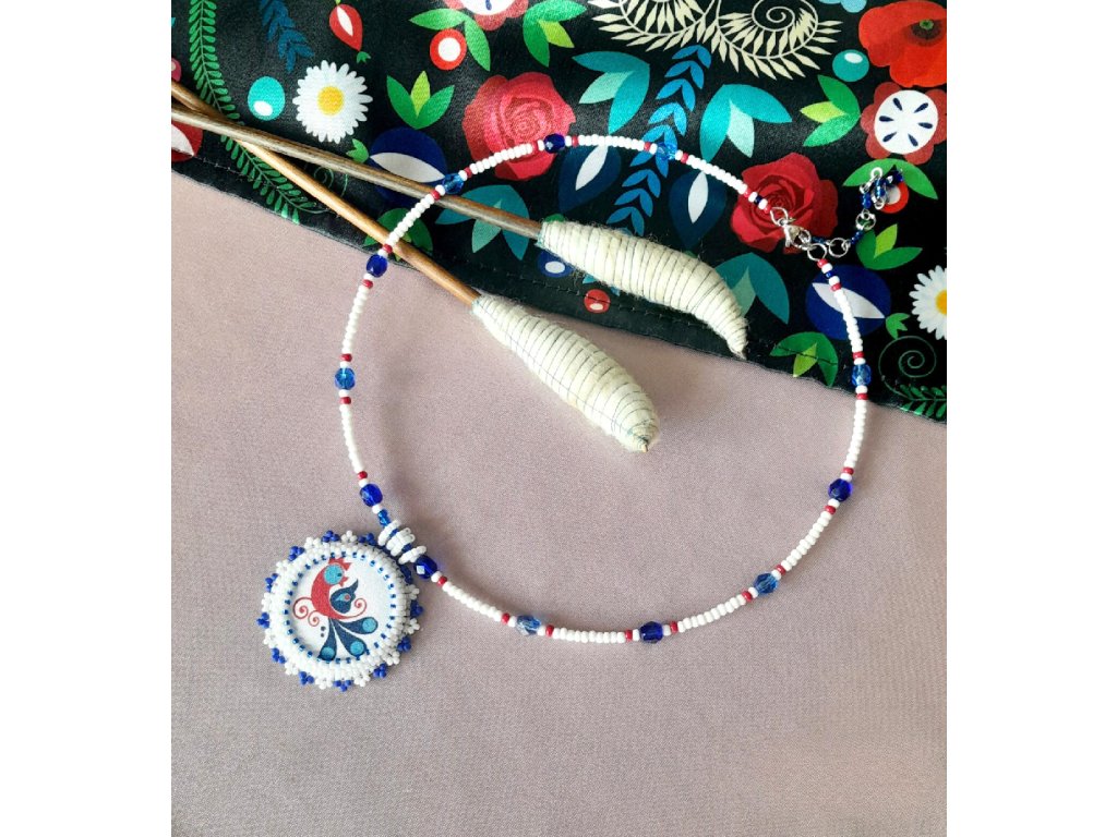 Náhrdelník s textilním přívěskem s lidovým motivem. Osloví ženu, které i v dnešní době nosí v srdci úctu ke tradici a odkazu našich předků, přestože již třeba nenosí kroj. Takovou, ve které pohled na ručně zpracovanou brož vykouzlí vzpomínku na prázdniny strávené u babičky na Moravě, nebo jí bude připomínat večery u cimbálu a protancované střevíce na pódiích či mimo ně v rámci folklórních festivalů. Nebo takovou, kterou rázem přenese zpět do chvíle, kdy se zúčastnila přípravy krojovaných hodů v roli příslušnice chasy či dokonce stárky. Náhrdelník osloví i ženu takovou, která kouzlo naší lidové kultury teprve nesměle okukuje a ráda by se časem dozvěděla více.