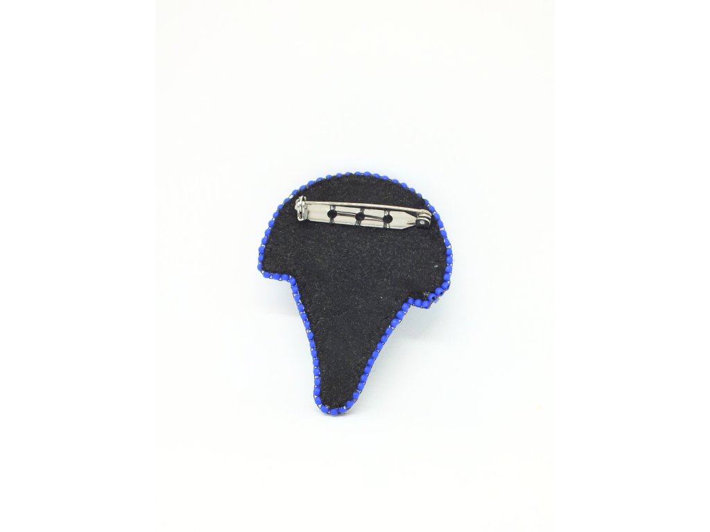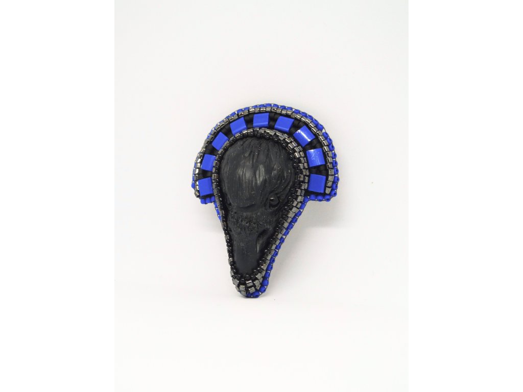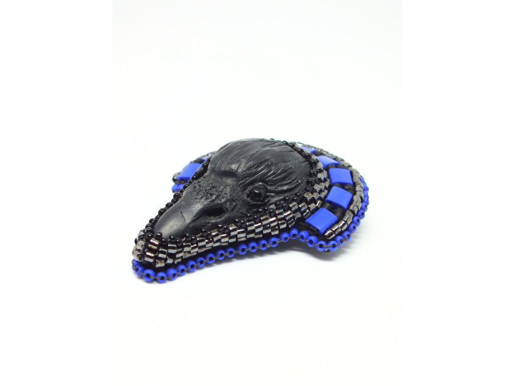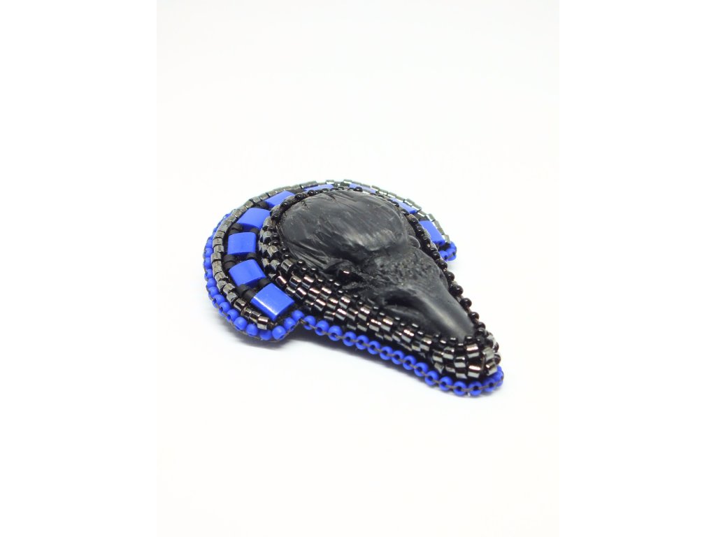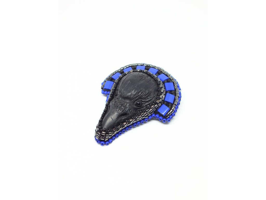 Brož je vytvořena technikou korálkové výšivky ze skleněných perliček a perlí. Ústřední motiv tvoří havraní hlavička z z polymerové hmoty z dílny české autorky Yanii Yanoushek, tvořící pod značkou Classy Lady. Ten je následně obšitý skleněnými perličkami. Zadní strana brože je začištěna umělou semiší. Zapínání na klasický brožový můstek s pojistkou proti ztrátě. Materiál kovu je nerezová ocel, kov tedy nemění barvy, nereziví a nešpiní Vaše oblečení.
