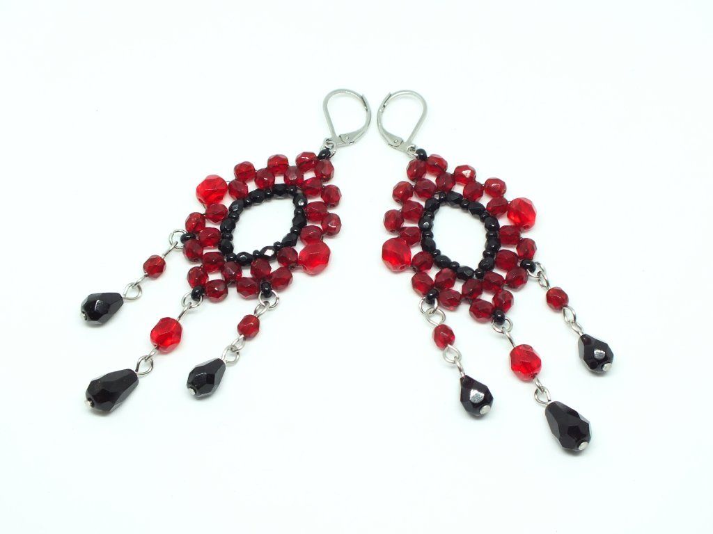 Výrazné a dlouhé šité náušnice z černých a vínově rudých skleněných perlí. Nestárnoucí elegantně-gotická klasika.