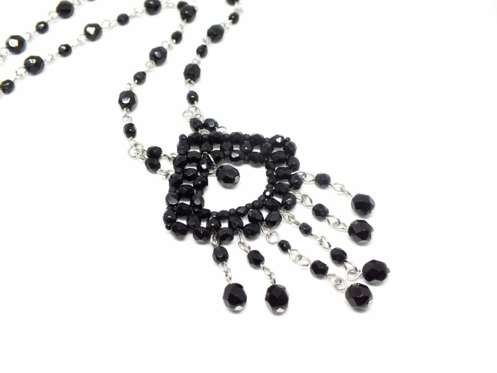 Elegantní šperk z černých skleněných perlí pro tajemnou goth dámu. Ketlovaný řetízek je doplněn šitým přívěskem. Svým designem připomíná gagátovou bižuterii, jenž se stala oblíbená koncem 19. století díky britské královně Viktorii.