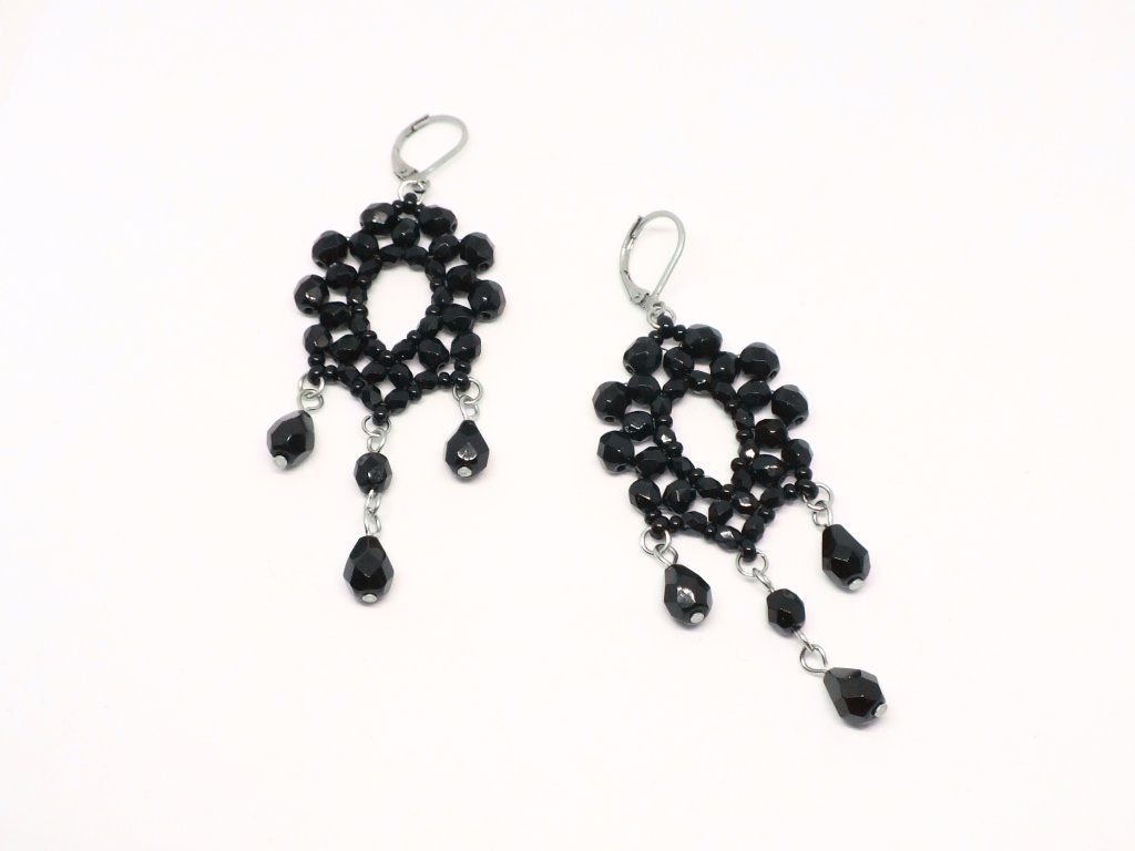 Visací kapkové náušnice v gothic stylu. Elegantní skleněný doplněk s nádechem tajemna a upírské estetiky. Ozdobit se jimi lze nejen na tematický koncert, ale i se na ples či jinou společenskou událost. Svým designem evokují fenomén tzv. černé bižuterie, jejíž obliba narostla koncem 19. stol. v souvislosti s odíváním královny Viktorie, v té době již vdovy.