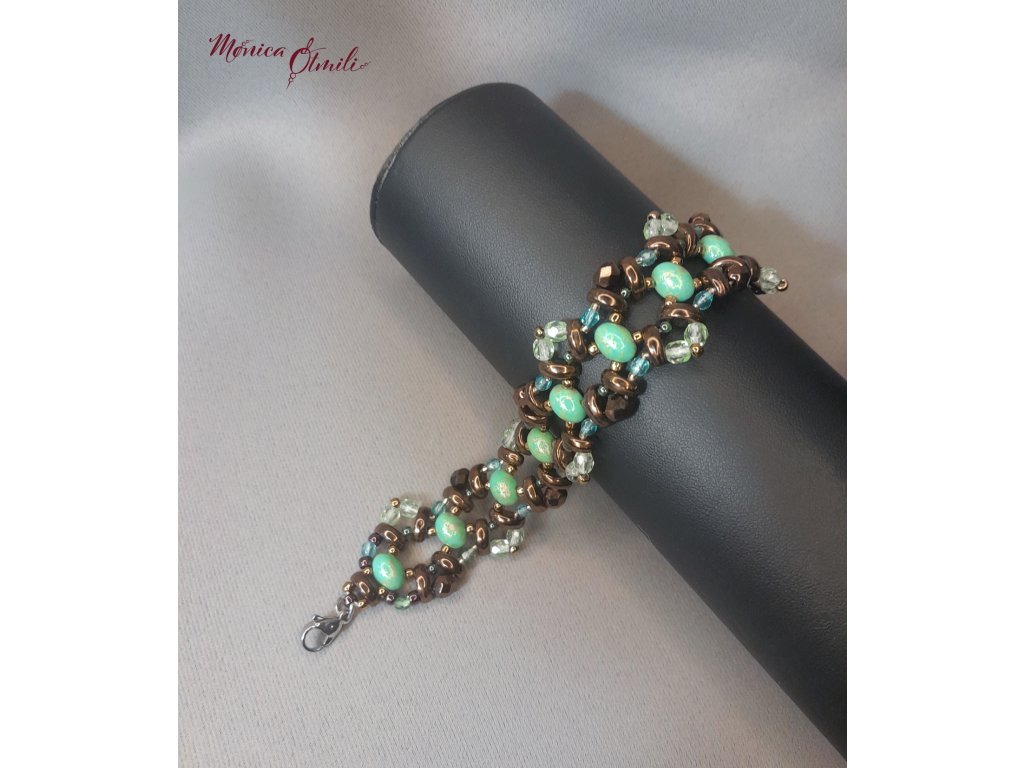 Šitý náramek s autorským vzorem z českých 2-dírkových mačkaných a broušených skleněných perlí.