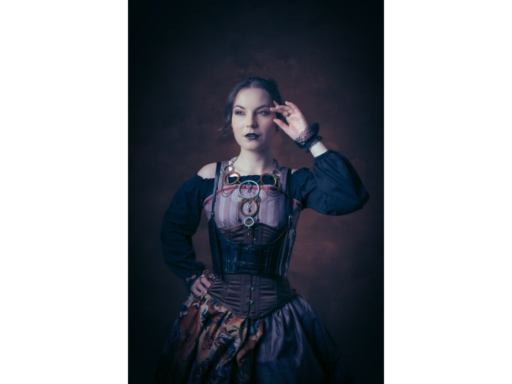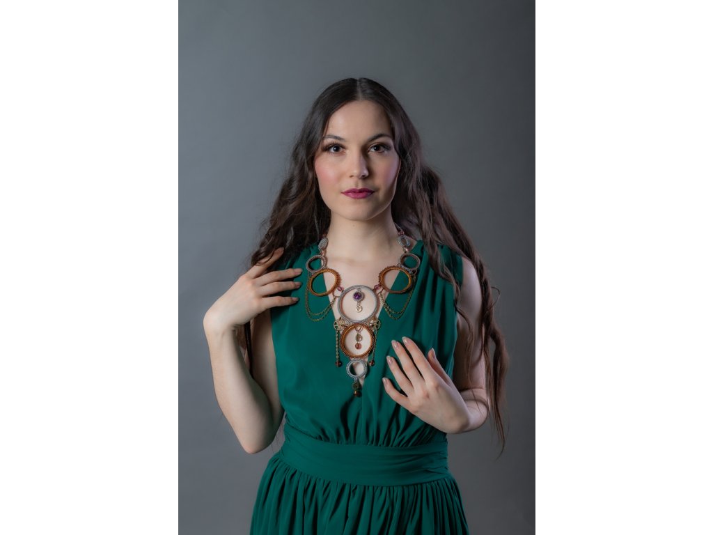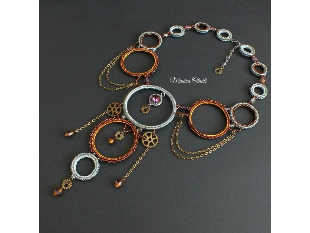 Luxusní steampunkový náhrdelník tvořený ze 13-ti šitých, obručí vyztužených kruhů.