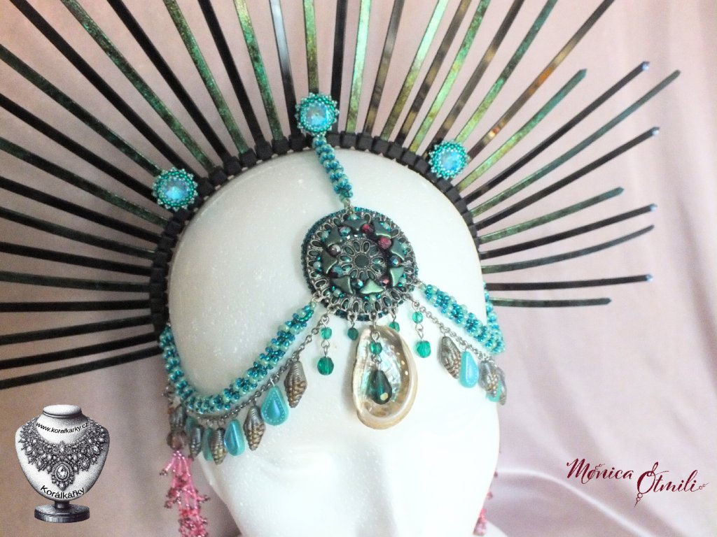 Luxusní koruna a diadém v jednom, s mořskými motivy a mušlí haliotis. Jedinečná ozdoba hlavy nejen pro mořské panny. Čelenka byla vytvořena do soutěže na mezinárodní festival šitého šperku Beading Festival Prague.