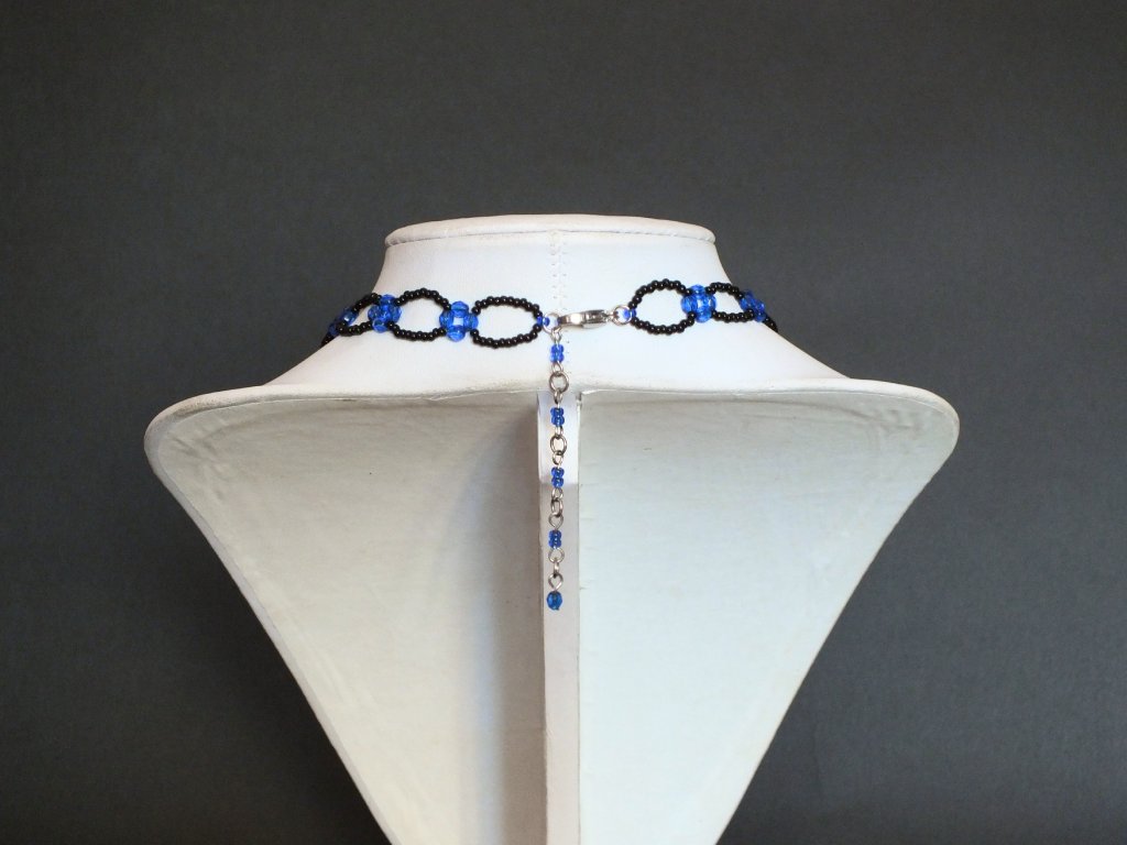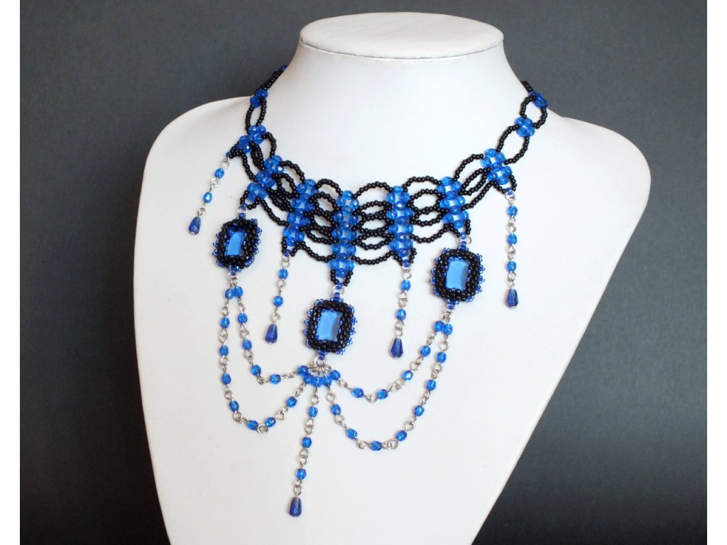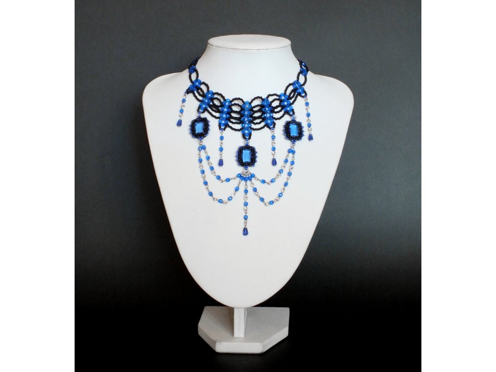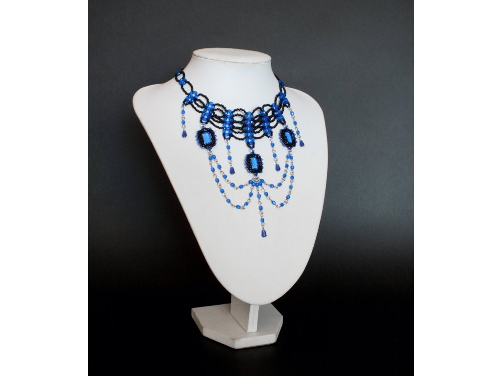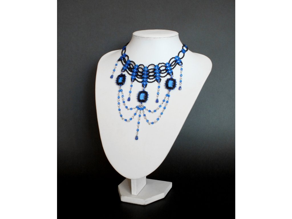 Je zhotoven ze skleněných broušených perlí, rokajlu a skleněných kamenů české výroby. Šitá obojková část je pak doplněna volně spadajícími přívěsky, jejíž ústřední motiv tvoří obšívané skleněné šatony české výroby v transparentní modré barvě.