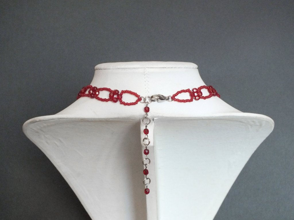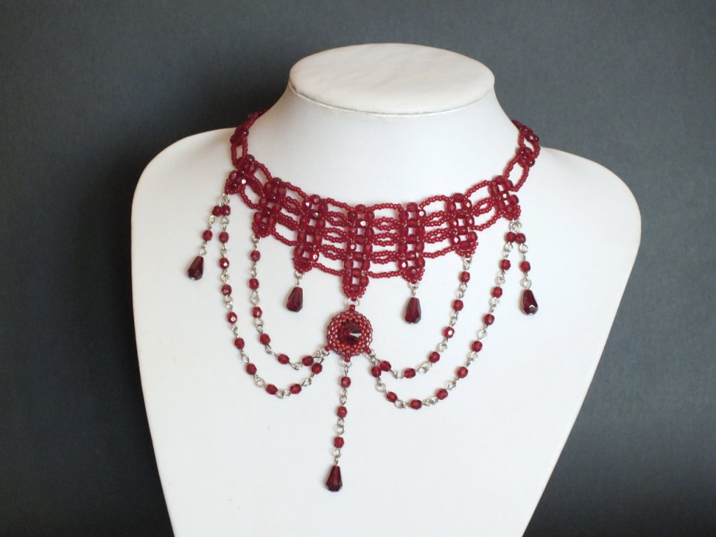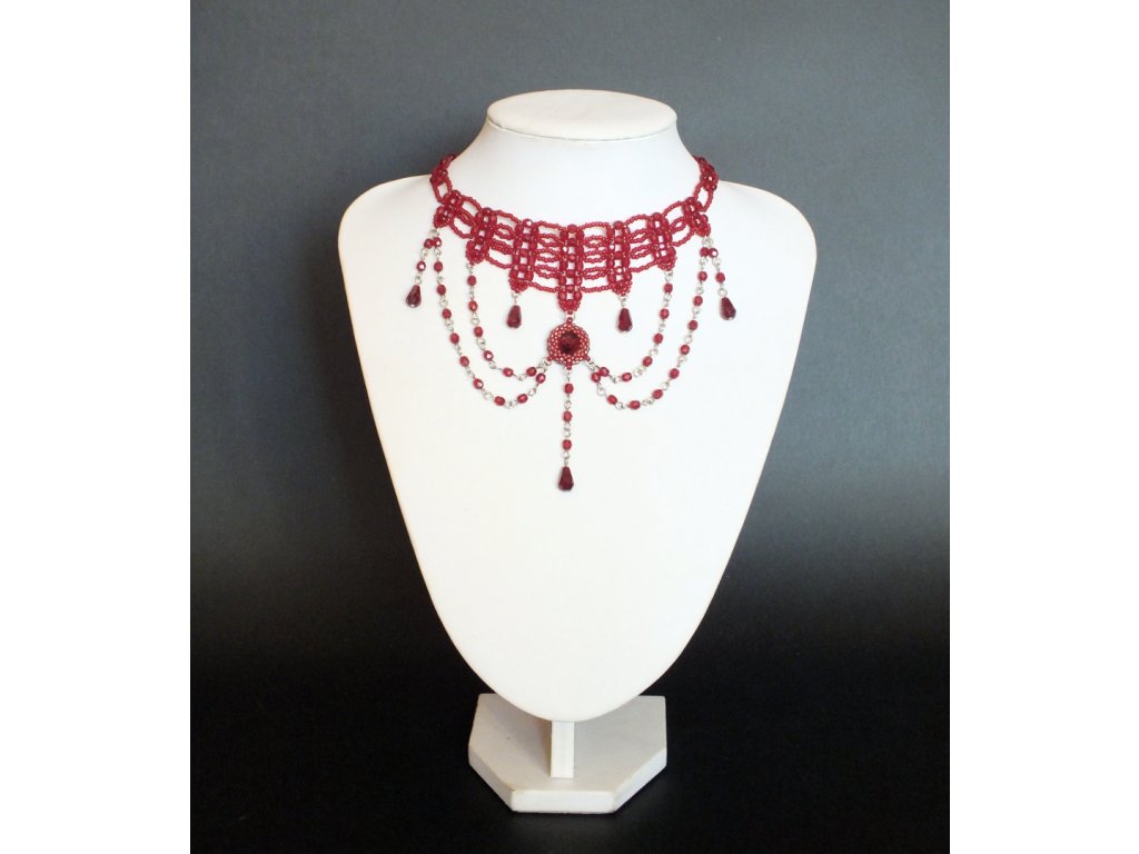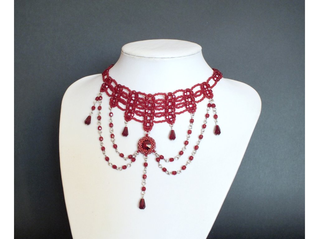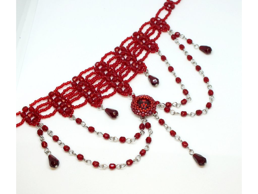Je zhotoven ze skleněných broušených perlí a rokajlu. Šitá obojková část je pak doplněna volně spadajícími přívěsky, jejíž ústřední motiv tvoří obšívaný Swarovski krystal v rudé barvě.