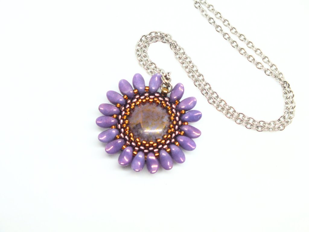Romantický květinový přívěsek v barvách podzimu. Zavěšen na řetízku z kvalitní nerezové oceli. Harmonická kombinace fialové a bronzové potěší nejen podzim milující duše.