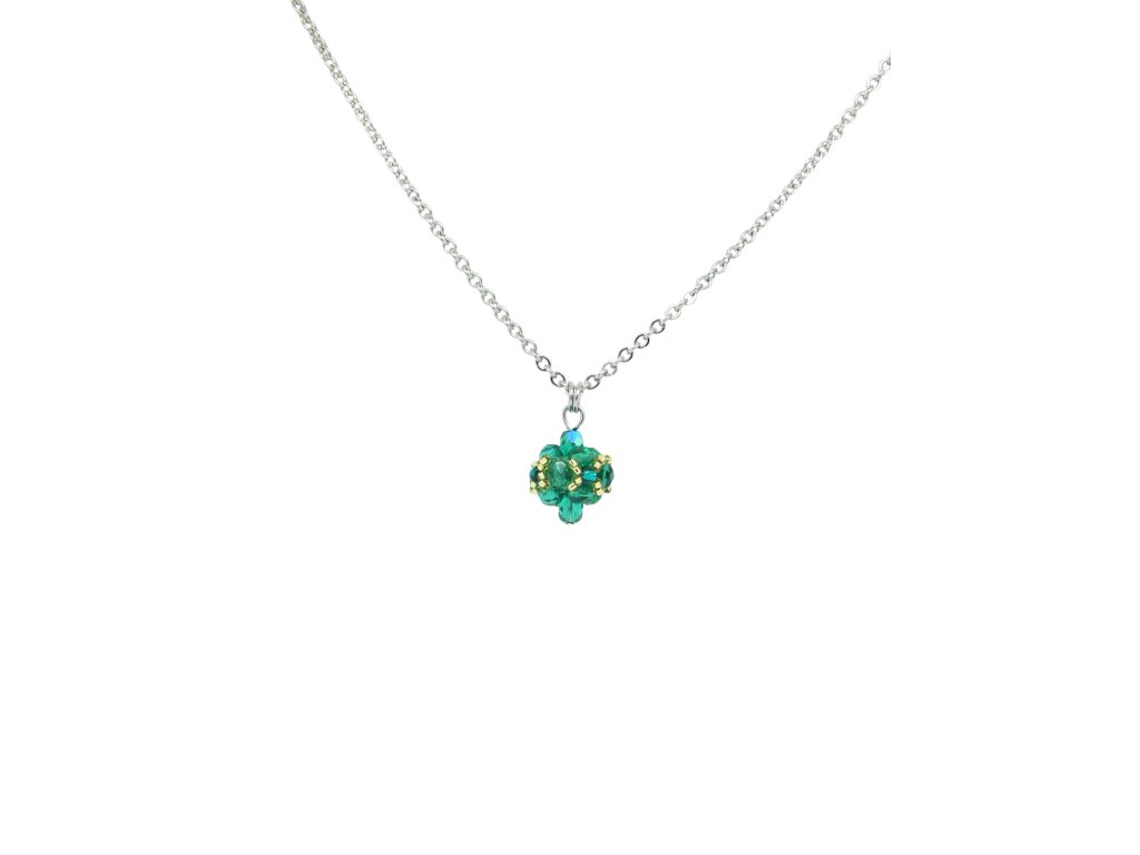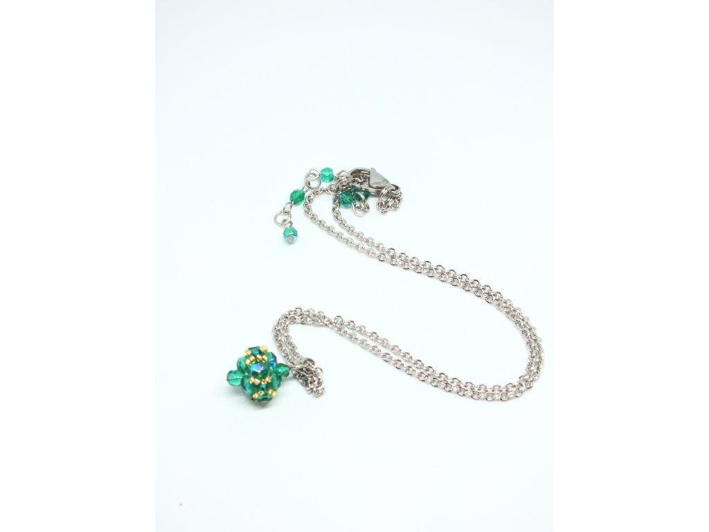 Jemný řetízek doplněný decentním přívěskem šitým z perliček v lahvově zelené barvě. Drobnější šitý šperk vhodný pro denní nošení.