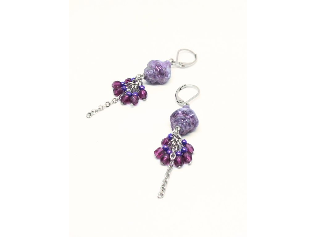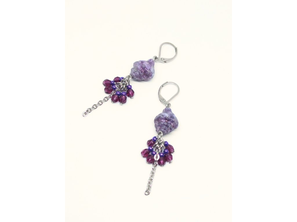 Ketlované náušnice s fialovými skleněnými ulitami mořských šneků odloví všechny milovnice moře a ženy, v nichž se ukrývá duše najády či mořské panny. Tyto drobnější náušnice jsou vhodné pro denní nošení, a tak Vám mohou dovolenou u moře připomínat pokaždé, když budete mít náladu.