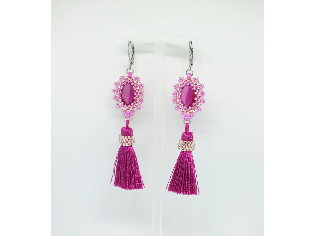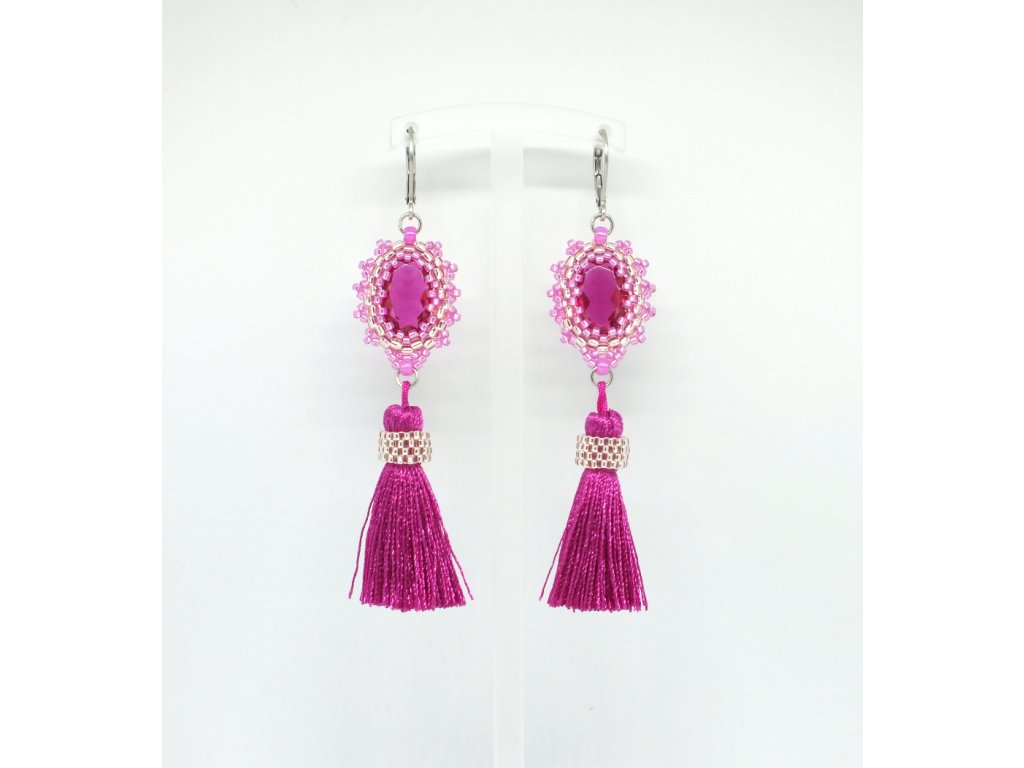 Výrazné visací náušnice s broušenými krystaly v nepřehlédnutelné magenta - cyklámenové barvě, doplněné textilními střapci. Elegantní klasika broušeného skla je doplněna přívěsky v podobě obšívaných textilních střapců, které dodají celému looku nádech hravosti a sex-appealu. Nebojte se být vidět a podpořte svou ženskost fascinující barvou.