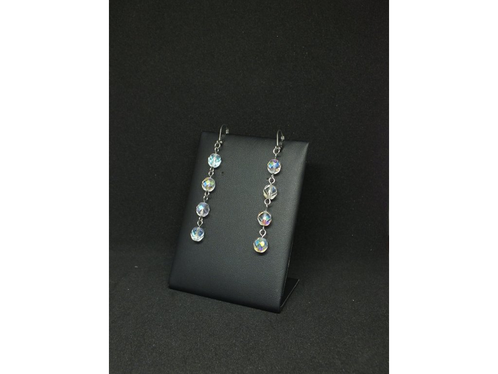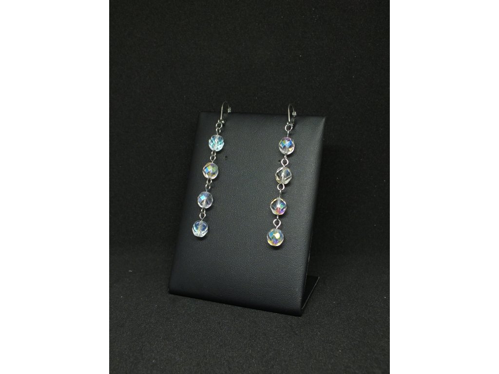 Dlouhé ketlované náušnice z čirých skleněných perlí s duhovým efektem. Duhový efekt použitého materiálu skvěle pracuje se světlem a dodává náušnicím jemný třpyt a odlesky. Mohou fungovat samostatně nebo jako doplněk ke stejnojmennému náhrdelníku.
