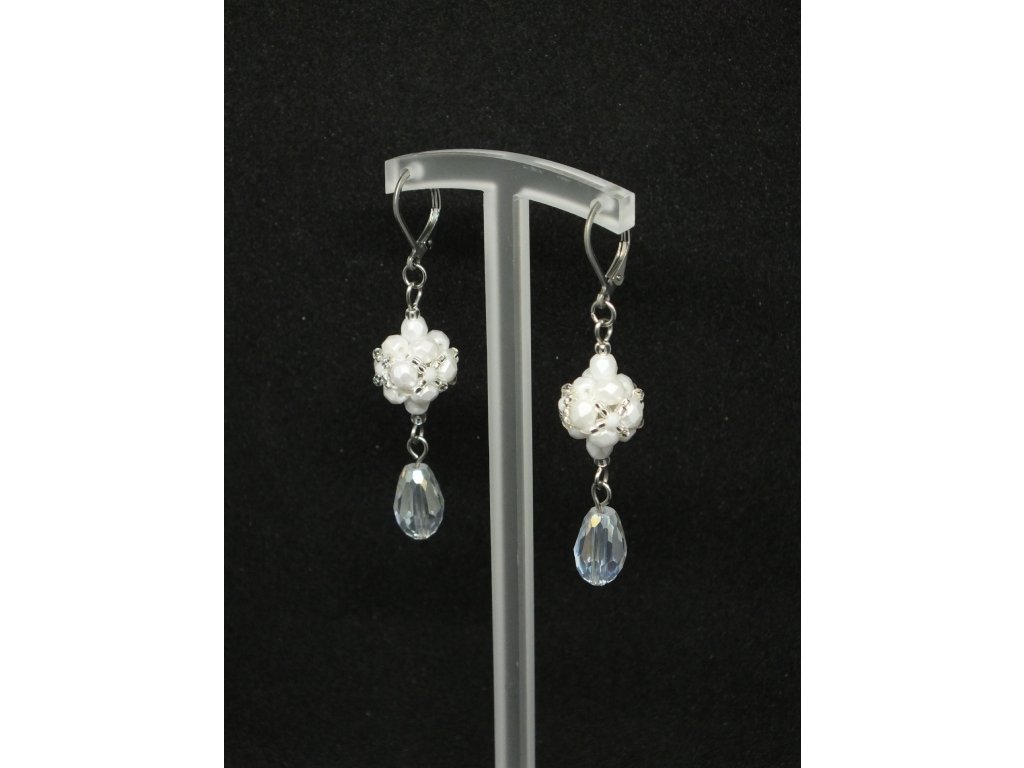 Visací náušnice v podobě šitých kuliček, doplněné broušenými skleněnými kapkami. Elegantní doplněk pro Váš velký den.