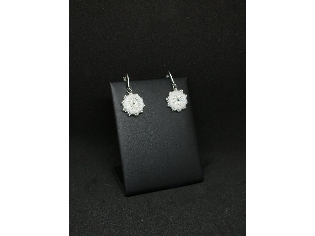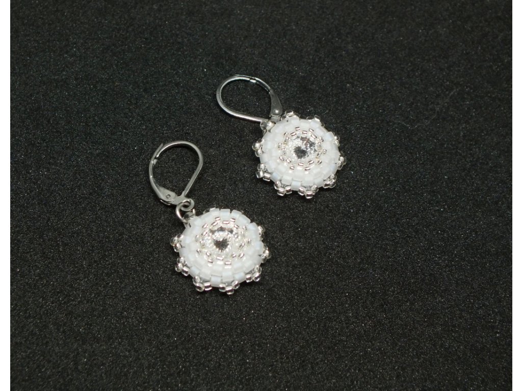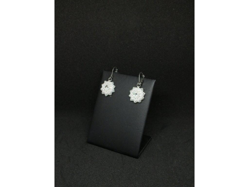 Velmi drobné visací náušnice s malinkými broušenými krystaly Swarovski, které jsou obšity skleněným rokajlem. Zapínání z chirurgické oceli činí tyto náušnice vhodnými i pro alergiky. Náušnice se díky krystalům jemně třpytí, díky své velikosti však zůstávají decentním šperkem. Svým charakterem jsou mimořádně vhodné jako doplněk ke svatebním šatům se stříbrnými metalickými aplikacemi.