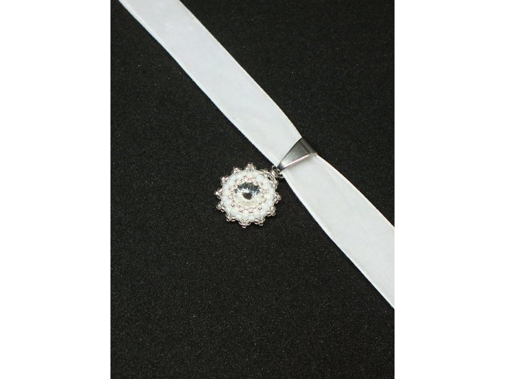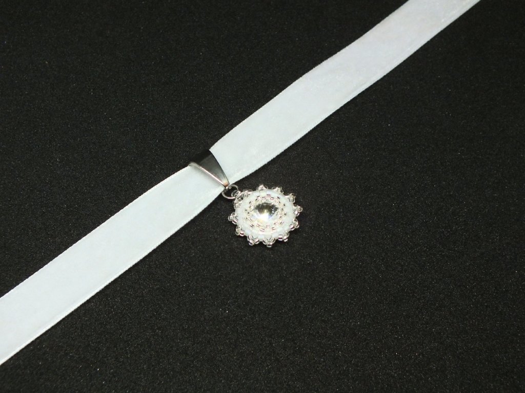 Sametka na krk s přívěskem představuje velmi ženskou elegantní tečku pro Váš svatební look. Decentní a rafinovaný šperk, který je mimořádně vhodný v kombinaci se svatebními šaty s korzetovým živůtkem či oblíbeným lodičkovým výstřihem.