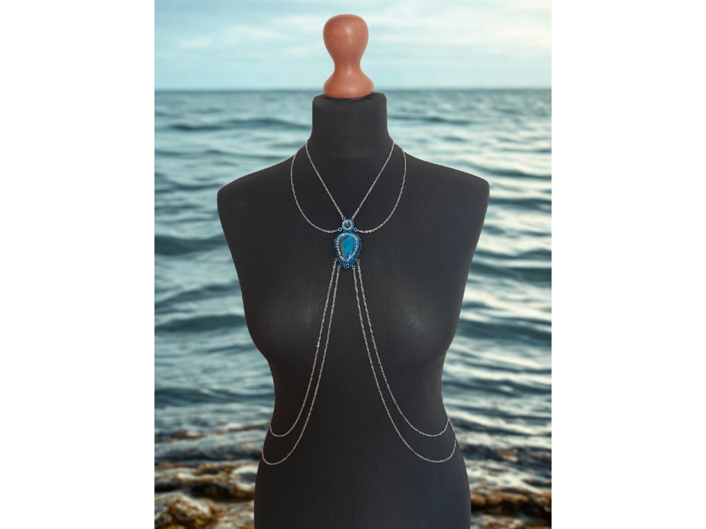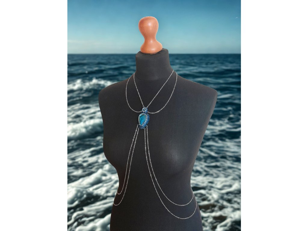 Decentní řetízky splývající po těle a uprostřed uhrančivý labradorit z něj dělají nepřehlédnutelný, avšak stále vysoce elegantní doplněk - šperk, který si doslova obléknete.