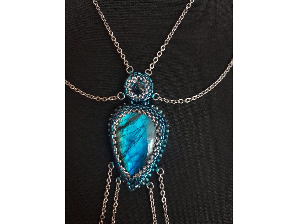 Ústřední motiv tvoří obšívaný kabošon labradoritu doplněný broušeným rakouským skleněným krystalem. Na výrobu byly použity ty nejkvalitnější japonské skleněné perličky. Veškeré kovové komponenty šperku jsou z nerezové oceli, řetízky tedy nečernají, nemění barvu a jsou vhodné i pro alergiky. Zapínání na karabinku a řetízek. Zadní strana minerálu je podšita Alcantarou - příjemnou veganskou semiší.