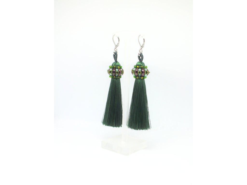 Střapce jsou ozdobeny prvky šitého šperku ze skleněných perlí a rojaklu. Mechanické zapínání z chirurgické oceli činí tyto náušnice vhodnými i pro alergiky.